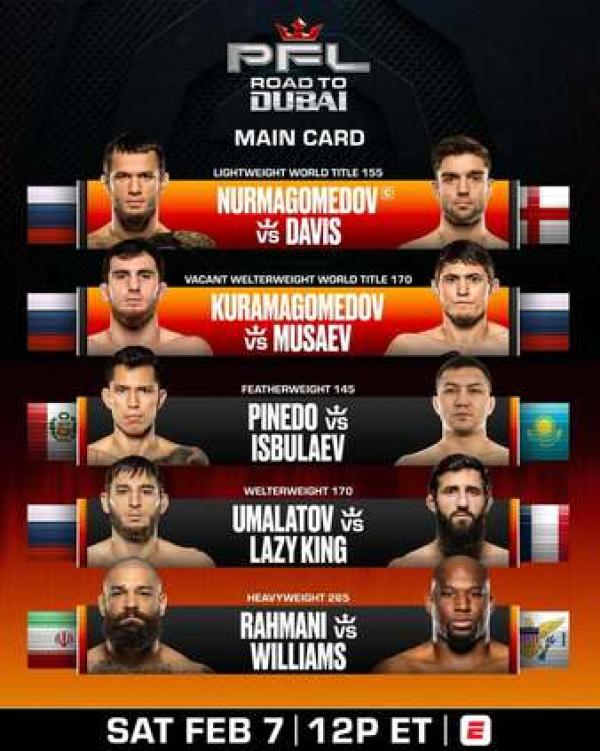 | | | Renat Khavalov | - | | PFL: Nurmagomedov vs Davis | Feb 07, 2026 | - | - | Dubai, United Arab Emirates |